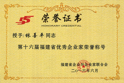 为弘扬优秀企业家深化改革、科学管理、与时俱进、勇于创新的开拓精神,激励广大企业家敢为天下先、爱拼才会赢的闯劲,为推动福建省产业转型升级和经济持续健康发展建功立业,近日,福建省企业与企业家联合会组织开展了每两年评选一次的福建省优秀企业家评选工作,并于2016年6月24日决定授予98位企业经营管理者“第十六届福建省优秀企业家”荣誉称号,虹润公司董事长林善平荣获该荣誉称号。