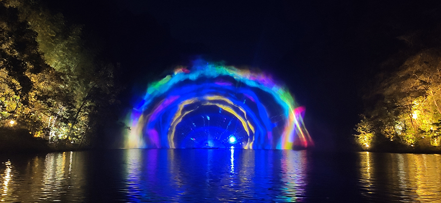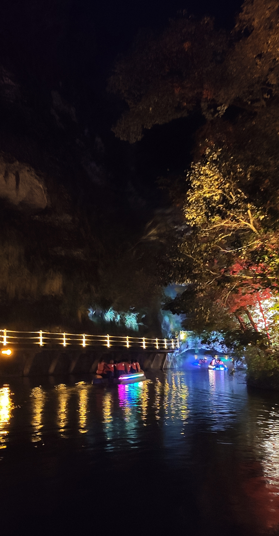 入夜,党支部一行来到本次文旅最精彩的项目:“夜游九龙潭”。以“夜游九龙潭,静享夜的美”为主题的“行进式”水上峡谷夜游景区,利用现代化声光技术与景区自然美景有机融合,让您充分感受“诗意山水,光影幻境”。听蛙唱虫奏,观月下仙境,月光映水,水波映月,加上临水栈道边笛声阵阵......让您真切的领会空灵、幽静、梦幻的别样意境。一路的声光风景让人目不暇接,如果不是身临其境,绝对感受不到那光影与大自然结合产生的绝妙意境。
