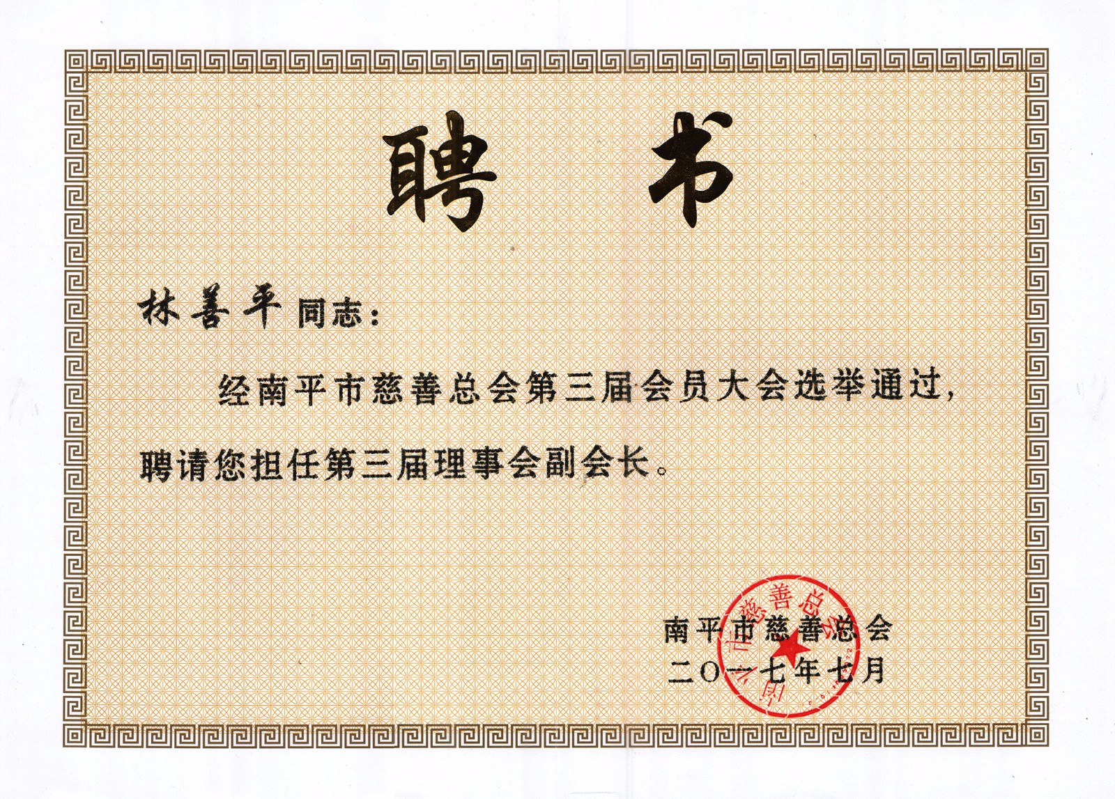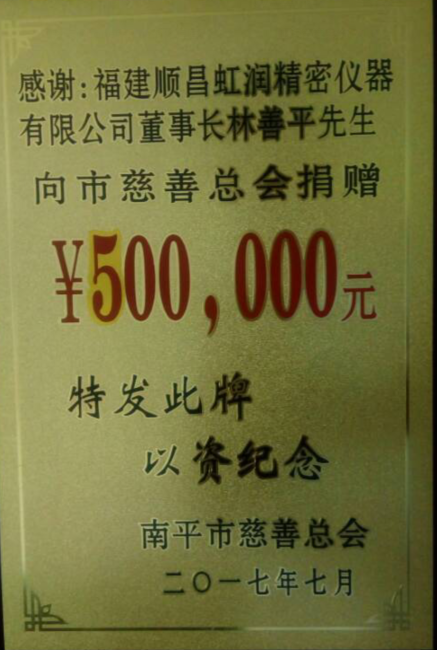 2017年7月28日,南平市慈善捐赠大会暨市慈善总会换届会议在南平市委举行,福建顺昌虹润董事长林善平再次当选为南平市慈善总会第三届理事会副会长,这也是林善平董事长第三次当选此职。同时,在本次慈善捐赠大会上,他再次向市慈善总会捐款50万元。他表示,他还将一如既往,继续加大对社会公益事业的支持力度,积极投身公益和慈善事业,为南平市的慈善事业作出更大的贡献。目前,林善平董事长各项公益捐款累计已达1000余万元。