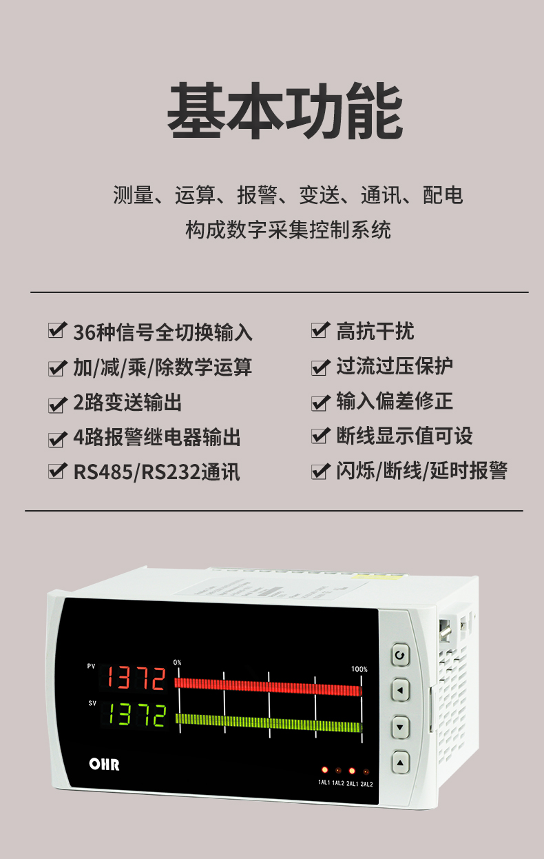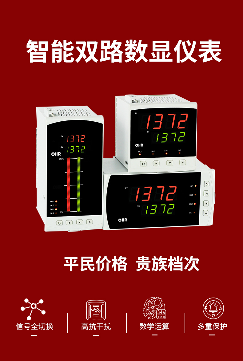 虹润公司是专业生产数显表的国家专精特新“小巨人”企业,生产的智能双路数显仪表,具有全切换信号输入,加减乘除数学运算,高抗干扰,过压过流保护,RS485/RS232通讯等特点。产品获得巡回检测显示方法及装置、仪表壳体等2项国家发明专利,主持起草工业过程控制系统用模拟输入两位或多位输出仪表、物联网智能温度仪表通用技术条件等2项国家标准,,以及通信系统多通道数据采集控制终端规范军用标准,参与国际5G标准制定,取得双回路数字显示控制仪表等3项相关软件著作权。产品广泛应用于电力、石化、冶金、化工、造纸、食品、轻工、制药、热处理、水处理、机械配套等各种工业现场。