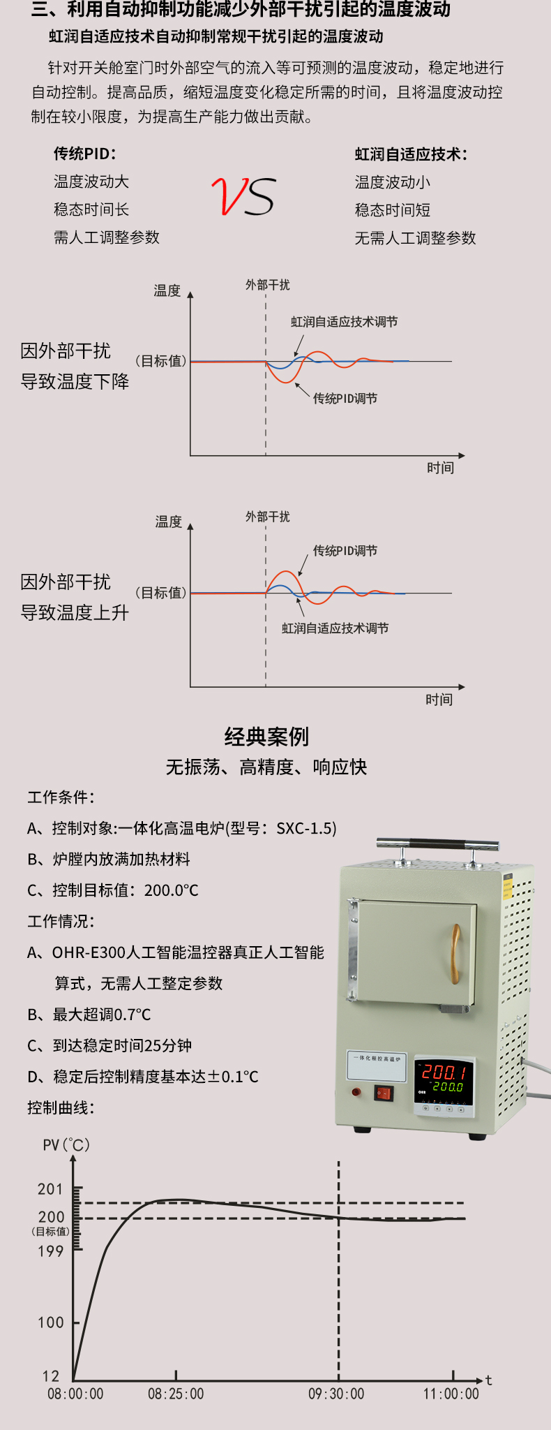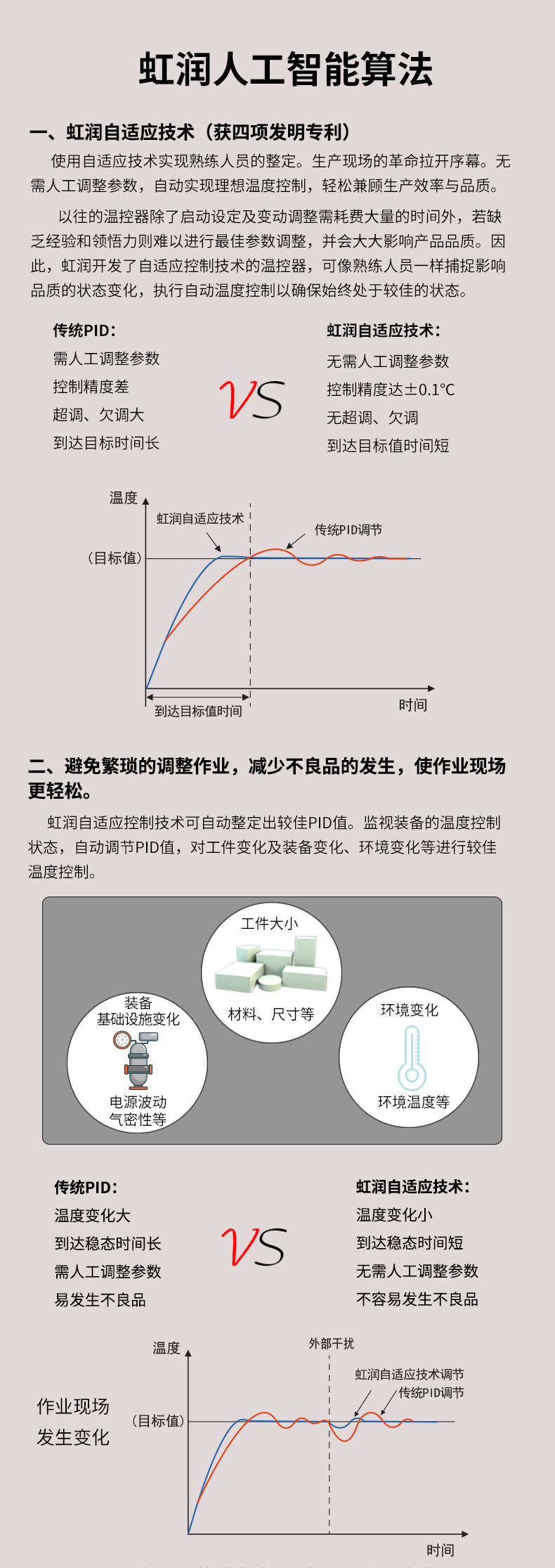 虹润公司是专业生产温控器的国家专精特新“小巨人”企业。生产的人工智能温控器,具有真正人工智能算式,无需人工整定参数,控制精度可达±0.1°C,多种输出类型,高抗干扰等特点。产品获得模糊PID控制仪及控制方法、人工智能调节器、智能化控制器、移相触发控制器、阀门自动手动无扰动操作控制方法及装置等5项国家发明专利,主持起草工业过程控制系统用模拟输入两位或多位输出仪表、物联网智能温度仪表通用技术条件、工业过程测量和控制系统用智能调节器等3项国家标准,以及通信系统多通道数据采集控制终端规范军用标准,参与国际5G标准制定,取得模糊PID温控仪等3项相关软件著作权。产品广泛应用于电力、石化,冶金、制药、食品等几乎所有工业现场,实现精准控温,保障生产安全与质量。