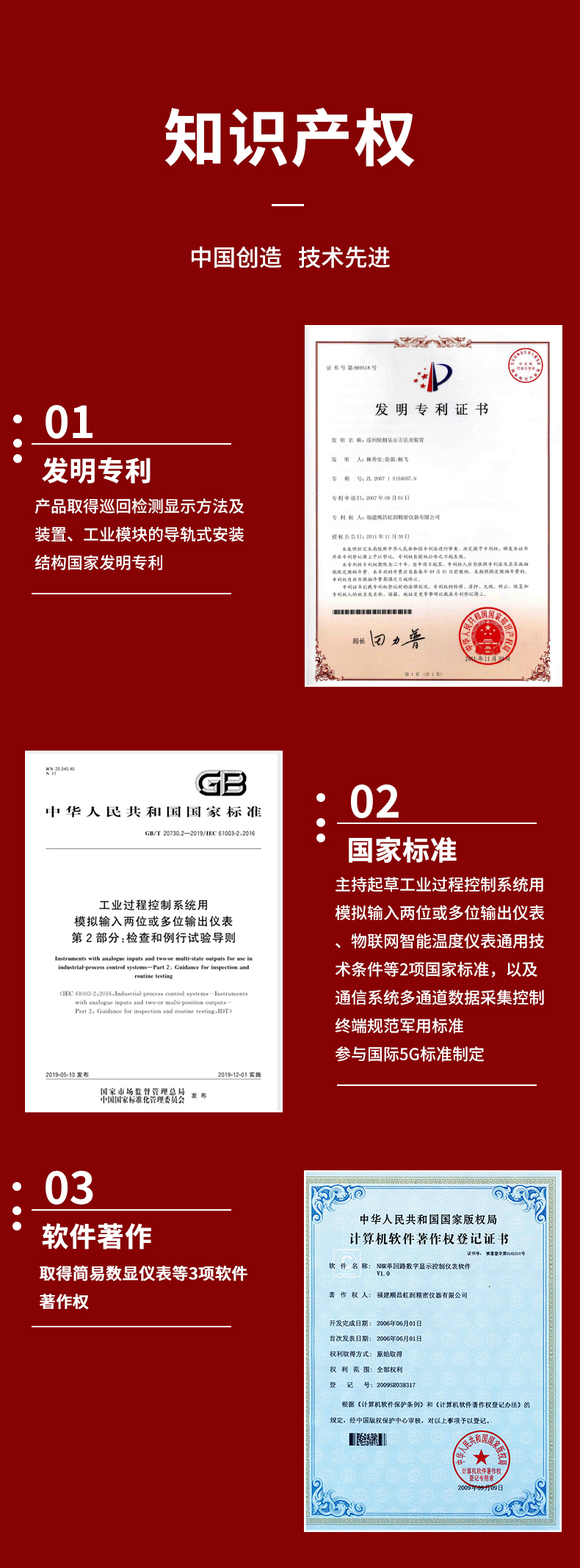 虹润公司是专业生产数显表的国家专精特新“小巨人”企业,生产的导轨式数显仪表,具有全切换信号输入,导轨壁挂共用,全隔离设计,高抗干扰,变送输出或RS485通讯等特点。产品获得巡回检测显示方法及装置、工业模块的导轨式安装结构等2项国家发明专利,主持起草工业过程控制系统用模拟输入两位或多位输出仪表、物联网智能温度仪表通用技术条件等2项国家标准,,以及通信系统多通道数据采集控制终端规范军用标准,参与国际5G标准制定,取得简易数显仪表等3项相关软件著作权。产品广泛应用于电力、石化、冶金、化工、造纸、食品、轻工、制药、热处理、水处理、机械配套等各种工业现场。