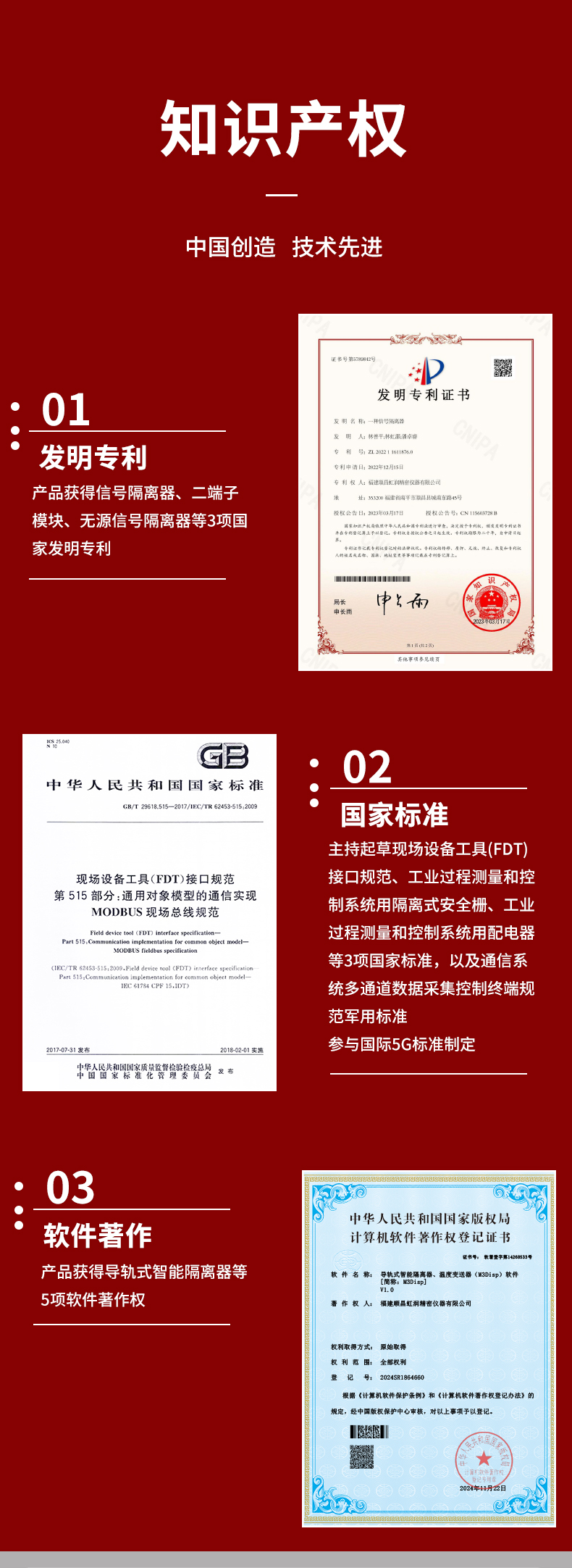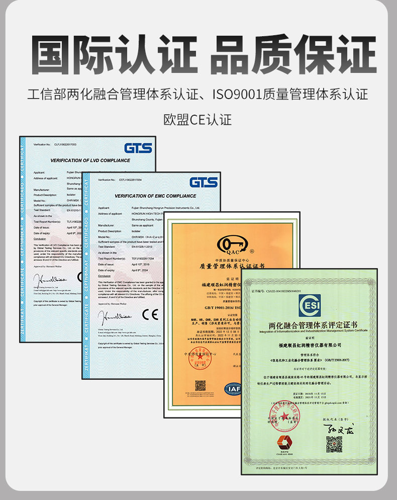 虹润公司是专业生产隔离器的国家专精特新“小巨人”企业。生产的智能信号隔离器涵盖电流电压变送器、温度变送器、配电器、频率转换器、开关量转换器及通讯转换器等多种产品类型。产品获得信号隔离器、一种二端子模块、无源信号隔离器等3项国家发明专利,主持起草现场设备工具(FDT)接口规范、工业过程测量和控制系统用隔离式安全栅、工业过程测量和控制系统用配电器等3项国家标准,以及通信系统多通道数据采集控制终端规范军用标准,参与国际5G标准制定,取得导轨式智能隔离器、频率转换器等3项相关软件著作权。产品广泛电力、冶金、工业电炉、变电站、高压电机房等需要电隔离的工业自动化控制系统。