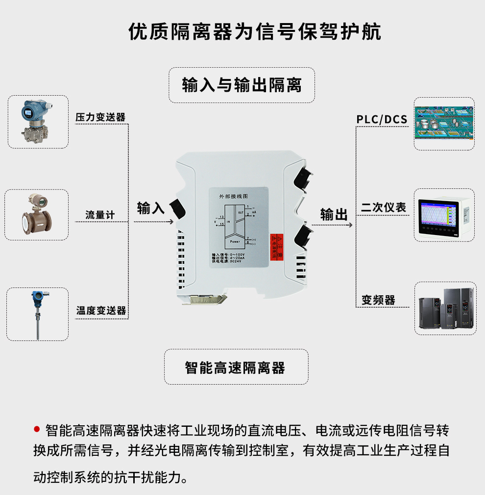虹润公司是专业生产隔离器的国家专精特新“小巨人”企业。生产的智能高速隔离器 ,具有电压电流远传电阻输入,10ms快速响应,输入输出电源三隔离,高抗干扰,低功耗发热低等特点。产品获得信号隔离器、一种二端子模块、无源信号隔离器等3项国家发明专利,主持起草现场设备工具(FDT)接口规范、工业过程测量和控制系统用隔离式安全栅、工业过程测量和控制系统用配电器等3项国家标准,以及通信系统多通道数据采集控制终端规范军用标准。取得智能高速隔离器等3项相关软件著作权。参与国际5G标准制定。产品广泛应用于电力、石化,冶金、制药、水处理、机械配套等各种工业现场。