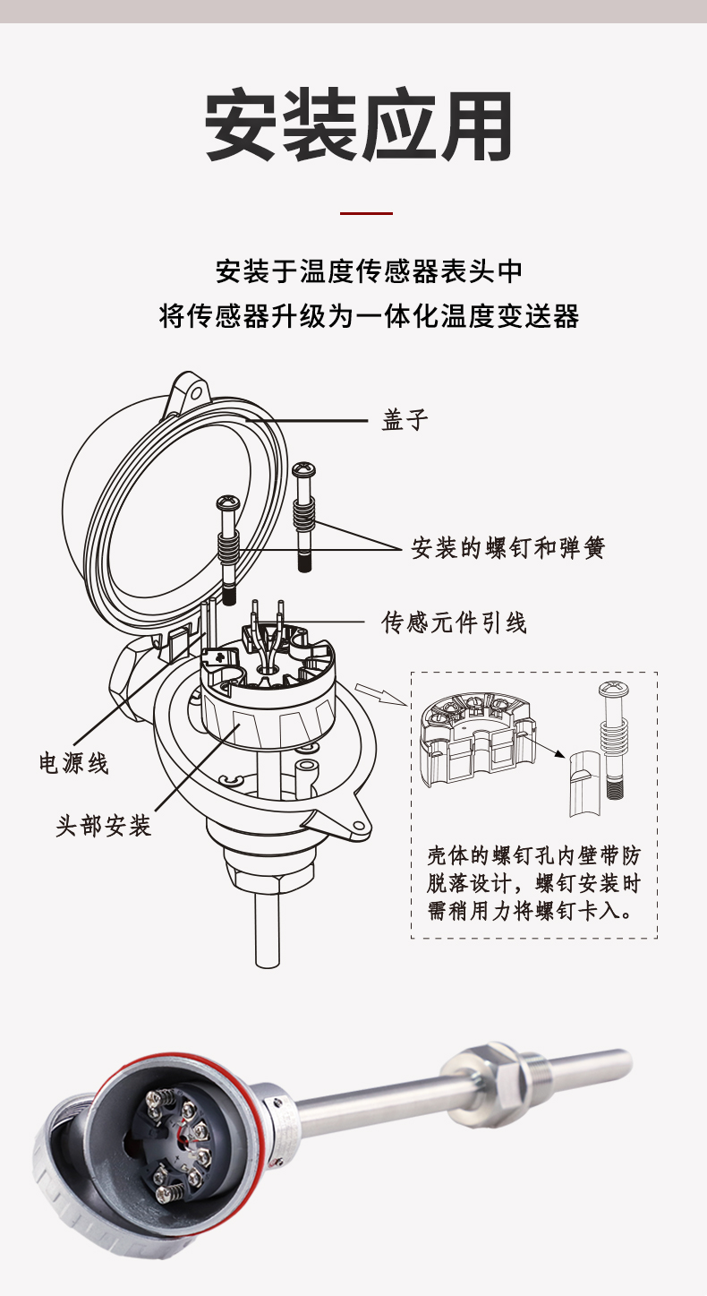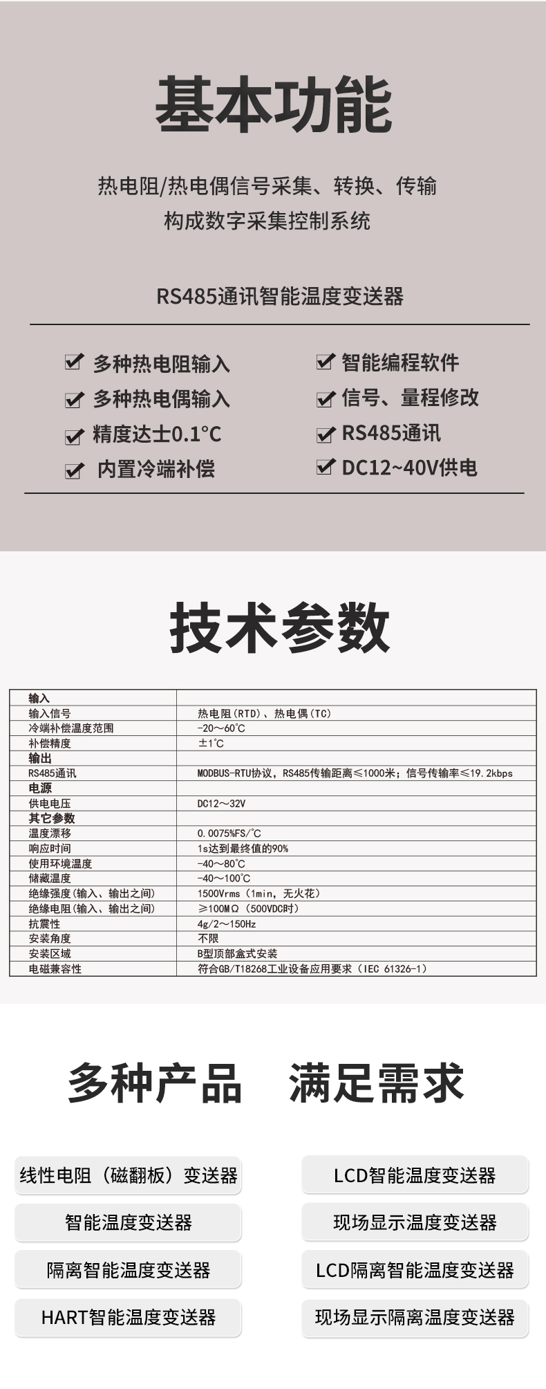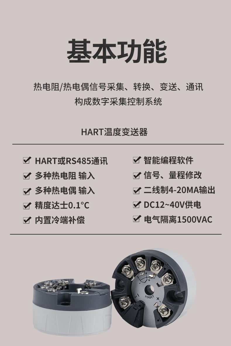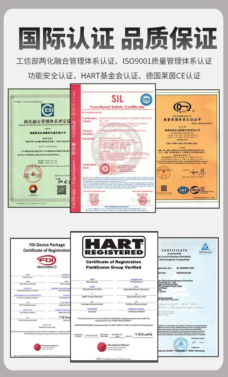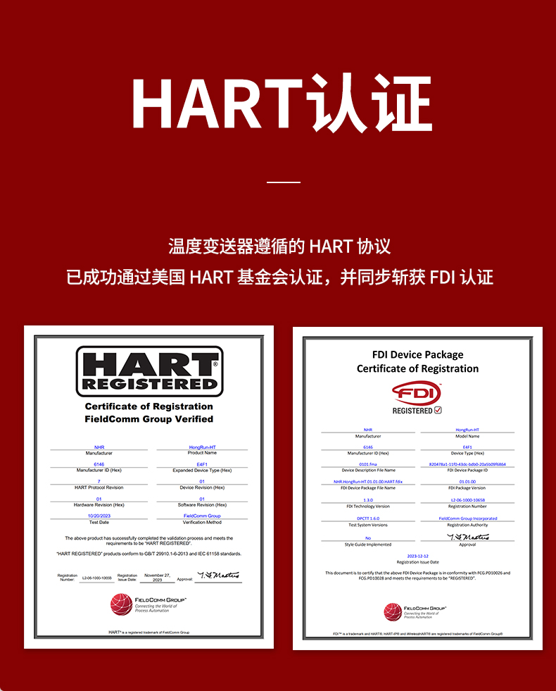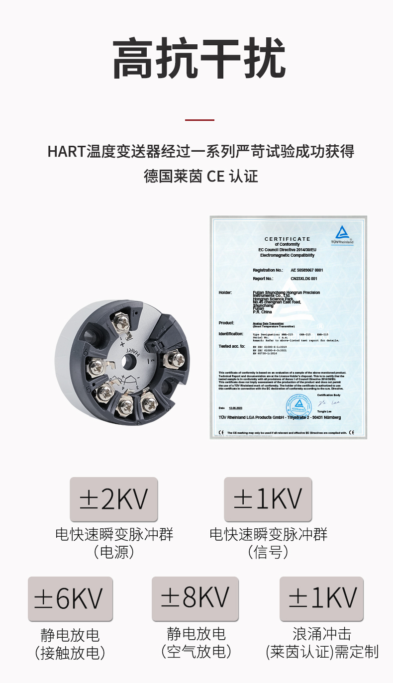 虹润公司是专业生产温度变送器的国家专精特新“小巨人”企业。生产的智能温度变送器,具有适配各类温度传感器,精度高,通过编程线修改输入信号类型及量程,高抗干扰,HART或485通讯等特点。该产品不仅通过HART基金会认证、德国莱茵 CE 认证与 SIL 功能安全认证,还获得具备减震抗干扰能力的温度变送器、信号隔离器、一种二端子模块、无源信号隔离器等4项国家发明专利,主持起草物联网智能温度仪表、现场设备工具(FDT)接口规范、工业过程测量和控制系统用温度变送器等3项国家标准,以及通信系统多通道数据采集控制终端规范军用标准,参与国际5G标准制定,取得HART温度变送器、智能温度变送器等3项相关软件著作权。产品广泛应用于石油、化工、电力、冶金、制药、食品、水处理等各种工业领域。。