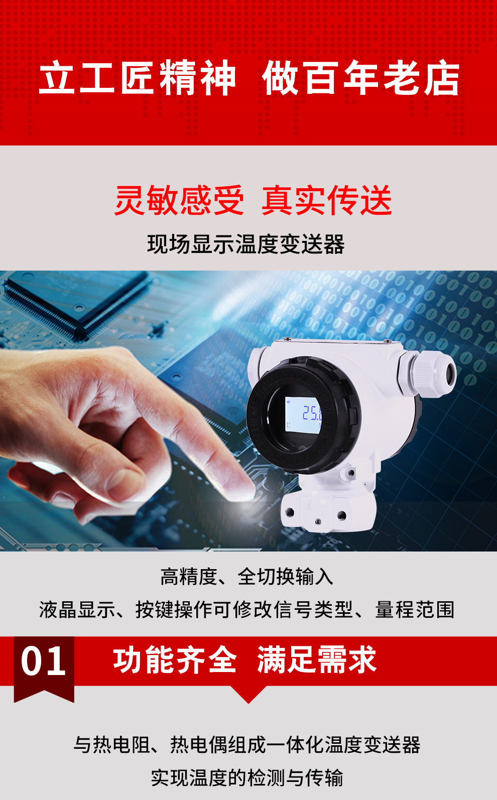 虹润公司是专业生产温度变送器的国家专精特新“小巨人”企业。生产的现场显示温度变送器,具有可修改输入信号类型,测量精度高,响应时间快,IP65防护等级等特点。该产品不仅通过德国莱茵 CE 认证与 SIL 功能安全认证,还获得具备减震抗干扰能力的温度变送器、信号隔离器、一种二端子模块、无源信号隔离器等3项国家发明专利。主持起草物联网智能温度仪表、现场设备工具(FDT)接口规范、工业过程测量和控制系统用温度变送器等3项国家标准,以及通信系统多通道数据采集控制终端规范军用标准。参与国际5G标准制定,取得高精度温度变送器等3项相关软件著作权。产品广泛应用于石油、化工、电力、冶金、制药、食品、水处理等各种工业领域。