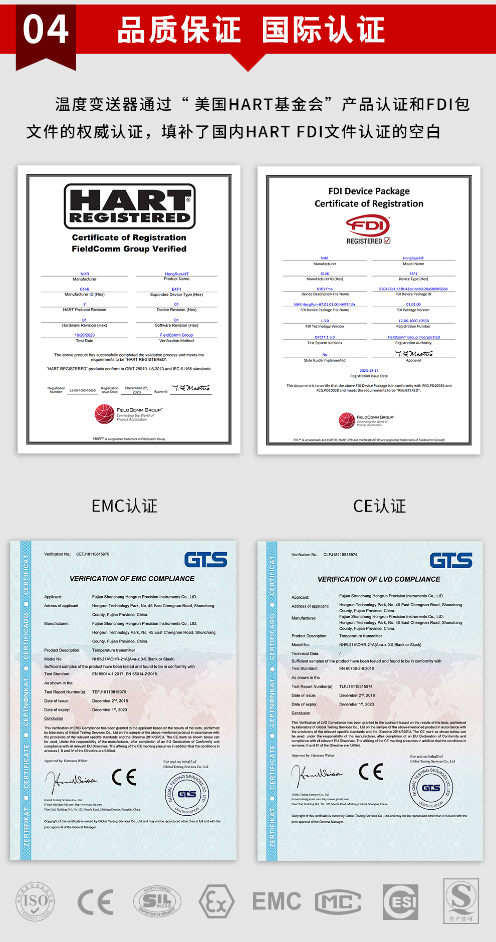 虹润公司是专业生产温度变送器的国家专精特新“小巨人”企业。生产的现场显示隔离温度变送器,具有可修改输入信号类型,测量精度高,稳定性好,带HART或RS485通讯计等特点。该产品不仅通过德国莱茵 CE 认证与 SIL 功能安全认证,还获得具备减震抗干扰能力的温度变送器、信号隔离器、一种二端子模块、无源信号隔离器等3项国家发明专利。主持起草物联网智能温度仪表、现场设备工具(FDT)接口规范、工业过程测量和控制系统用温度变送器等3项国家标准,以及通信系统多通道数据采集控制终端规范军用标准。参与国际5G标准制定,取得高精度温度变送器等3项相关软件著作权。产品广泛应用于石油、化工、电力、冶金、制药、食品、水处理等各种工业领域。
