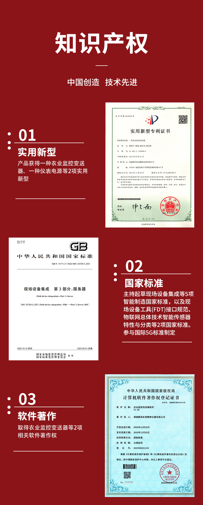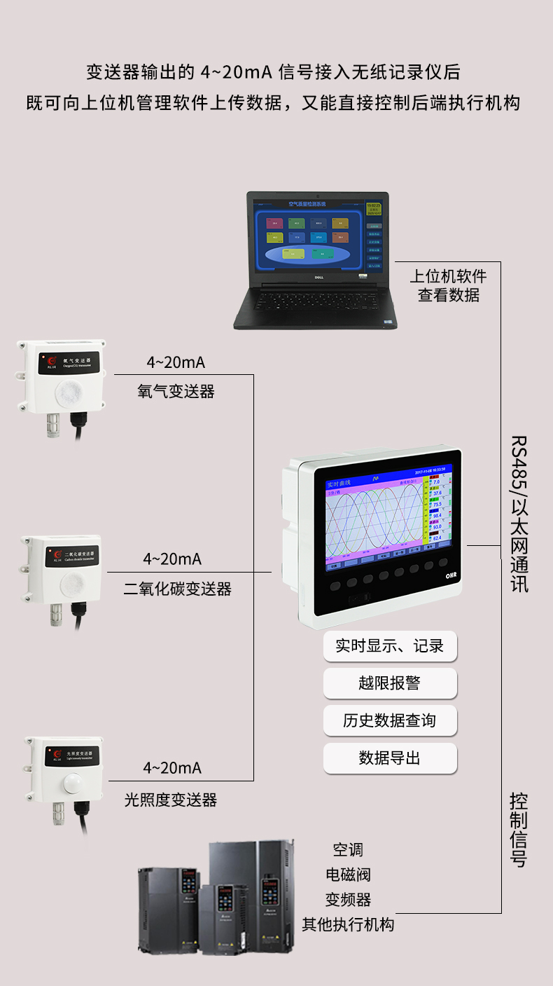 虹润公司是专业生产环境监测仪表的国家专精特新“小巨人”企业。生产的二氧化碳变送器,具有新型红外检定技术,自动温度补偿,响应灵敏,低功耗,模拟量变送输出或RS485通讯等特点。产品获得一种农业监控变送器、一种仪表电源等2项实用新型专利,主持起草现场设备集成等5项智能制造国家标准,以及现场设备工具(FDT)接口规范、物联网总体技术智能传感器特性与分类等2项国家标准,参与国际5G标准制定,取得农业监测变送器等3项相关软件著作权。产品广泛应用于机房、配电站、地下车库、工厂仓库、食品储存、养殖场、果蔬林园等环境场合对二氧化碳浓度的检测。