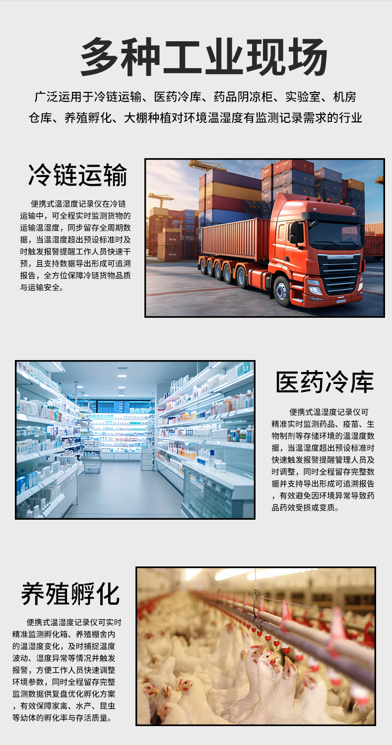 虹润公司是专业生产环境监测仪表的国家专精特新“小巨人”企业。生产的便携式温湿度记录仪,具有温湿度记录与转存,手机充电电池,磁吸或壁挂安装,故障报警提示,配上位机软件等特点。产品获得一种手持式低功耗温湿度检测仪、无纸记录仪等2项国家发明专利,主持起草物联网智能温度仪表通用技术条件、冷链温度记录仪等2项国家标准,通信系统多通道数据采集控制终端规范军用标准,以及现场设备集成等5项智能制造国家标准,参与国际5G标准制定,取得便携式温湿度记录仪等3项相关软件著作权。产品广泛应用于冷链运输、医药冷库、药品阴凉柜、实验室、机房仓库、养殖孵化、大棚种植等诸多领域。